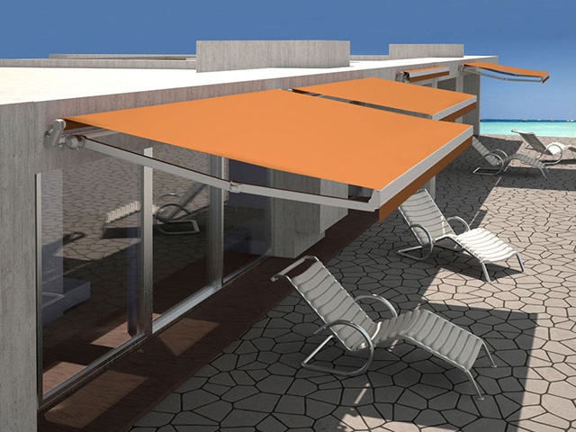 Tiene la ventaja de que los brazos extensibles no están obligados a ubicarse en los extremos del toldo sino que se pueden poner en cualquier otro lugar a lo largo de la barra, también permite colocar el número de sujeciones a la pared que se quiera a lo largo del toldo.